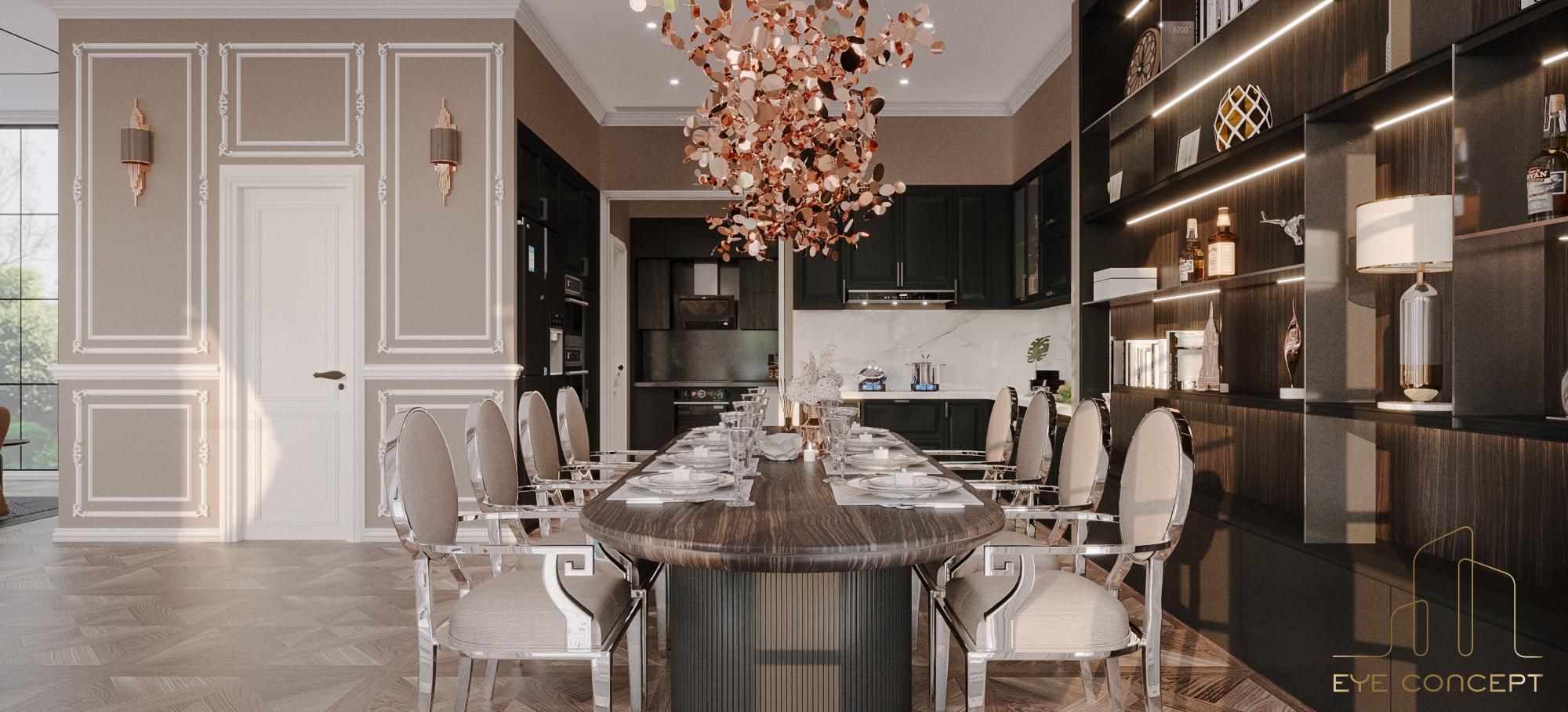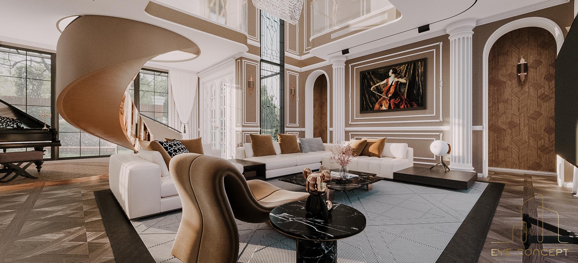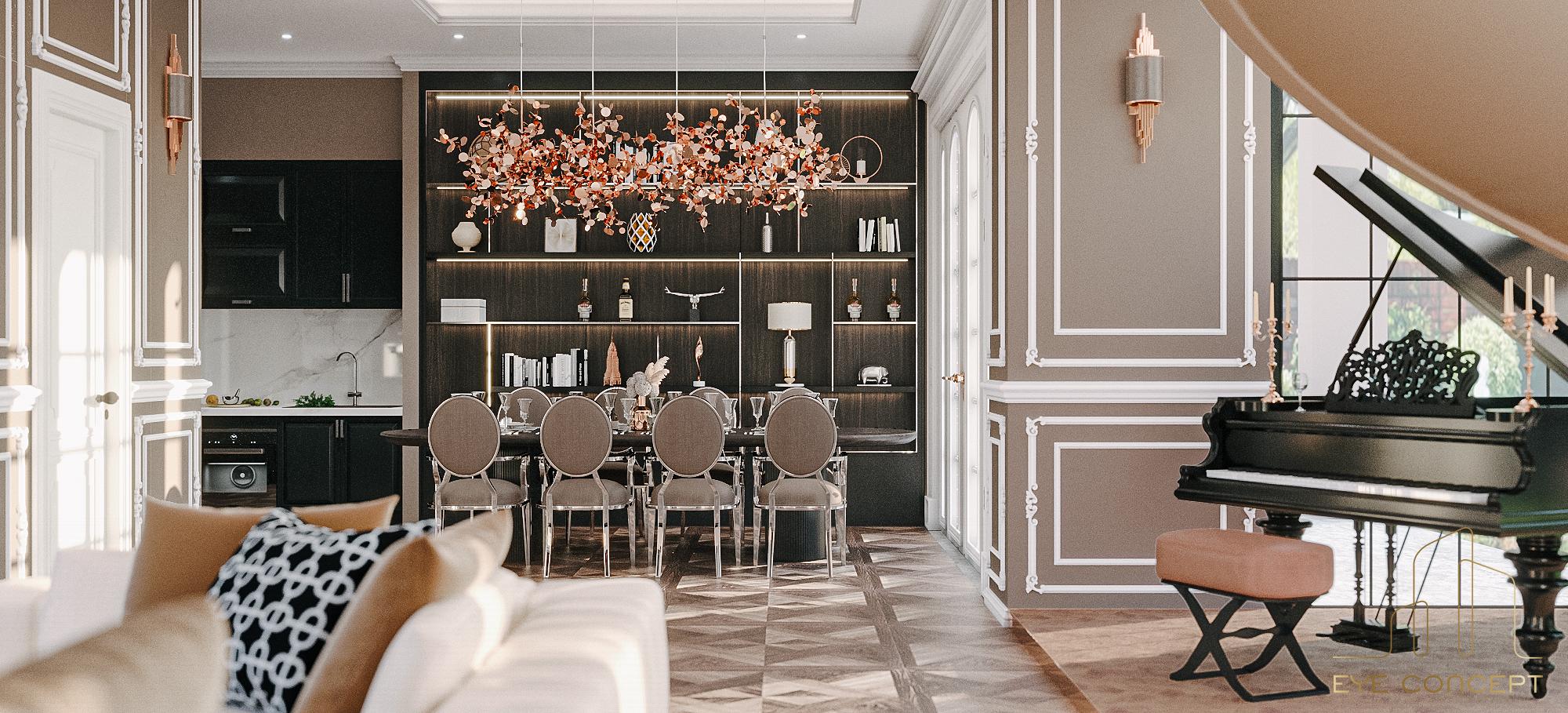 – Thông tin: Biệt thự Đơn lập Marina – một trong những sự lựa chọn thông minh cho các cư dân hiện đại thuộc khu đô thị sinh thái Ecopark. Eye Concept hướng chủ đầu tư tới phong cách thiết kế Tân cổ điển (Neo Classic) để tạo nên một tổng thể sang trọng, đẳng cấp, mang đến những nét riêng của thời đại, kết hợp với phong cách nội thất Art Deco, sử dụng trường phái “more is more” (nhiều chi tiết, nhiều đồ trang trí) nhưng vẫn giữ nguyên được sự tinh tế, gần gũi trong không gian sống. Đặc biệt, sự phối hợp hài hòa của yếu tố sáng tối nhờ vào họa tiết, hoa văn chạm trổ trên nền tường , sử dụng vật liệu tự nhiên như gỗ , đá hoa cương với các gam màu nóng đậm, sang trọng, tạo nên một không gian đặc biệt.
