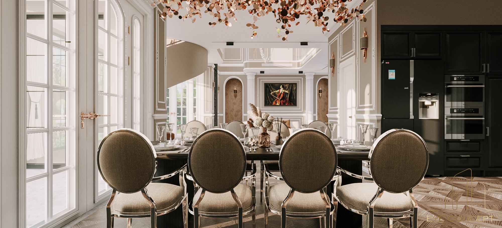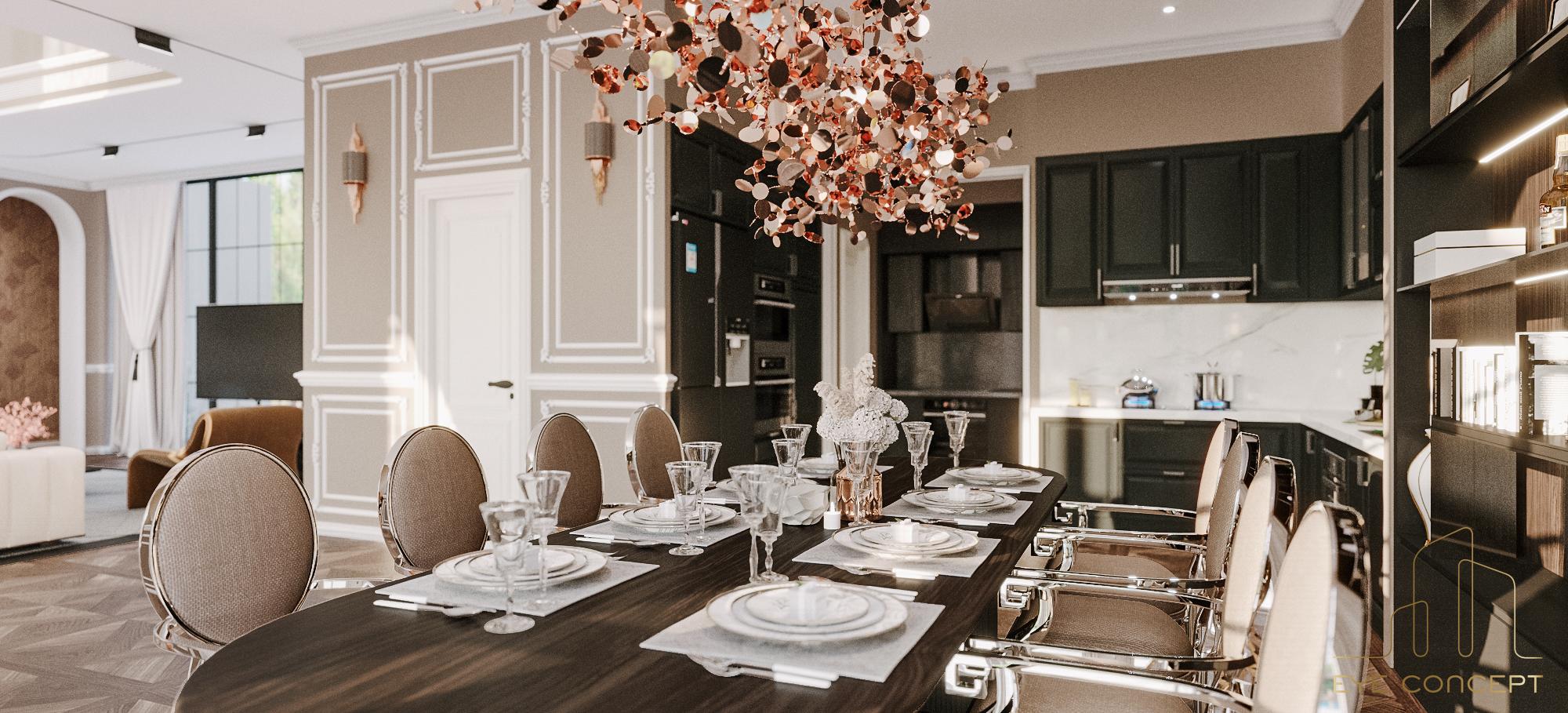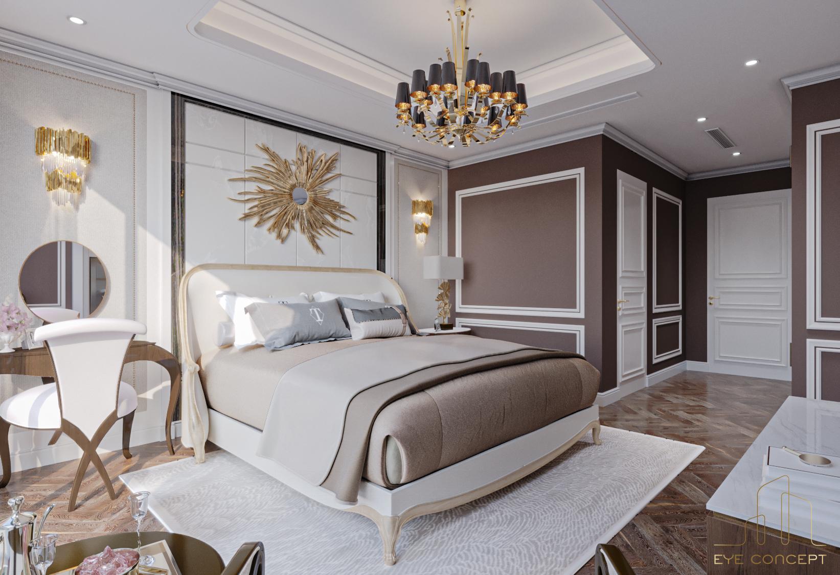 – Thông tin: Biệt thự Đơn lập Marina – một trong những sự lựa chọn thông minh cho các cư dân hiện đại thuộc khu đô thị sinh thái Ecopark. Eye Concept hướng chủ đầu tư tới phong cách thiết kế Tân cổ điển (Neo Classic) để tạo nên một tổng thể sang trọng, đẳng cấp, mang đến những nét riêng của thời đại, kết hợp với phong cách nội thất Art Deco, sử dụng trường phái “more is more” (nhiều chi tiết, nhiều đồ trang trí) nhưng vẫn giữ nguyên được sự tinh tế, gần gũi trong không gian sống. Đặc biệt, sự phối hợp hài hòa của yếu tố sáng tối nhờ vào họa tiết, hoa văn chạm trổ trên nền tường , sử dụng vật liệu tự nhiên như gỗ , đá hoa cương với các gam màu nóng đậm, sang trọng, tạo nên một không gian đặc biệt.