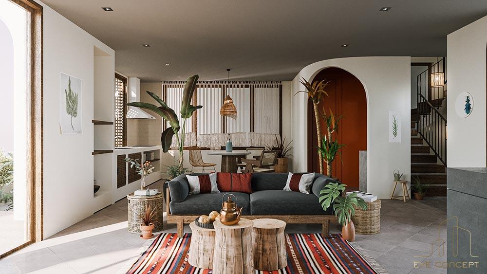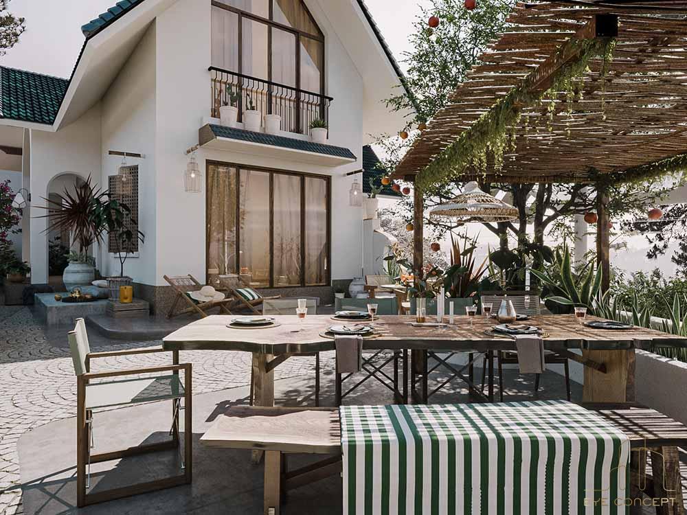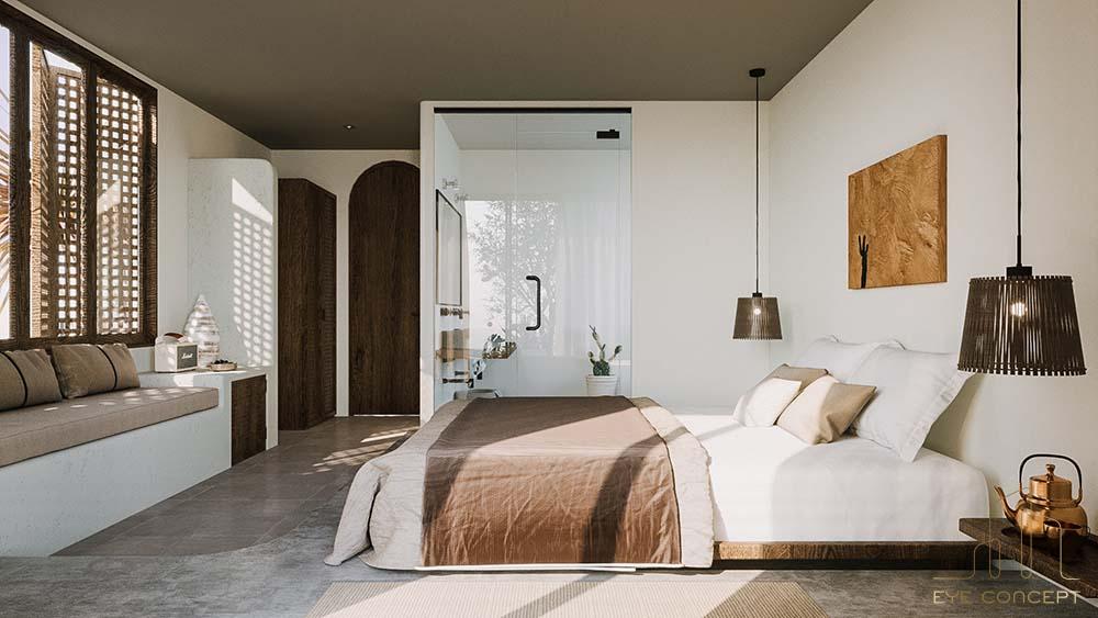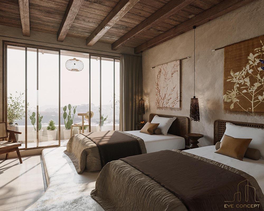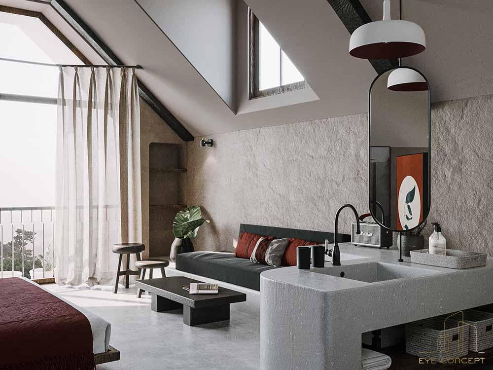 Dự án là bản vẽ được chắp nối từ ý tưởng của Chủ đầu tư, mong muốn tạo ra một không gian nghỉ dưỡng mộc mạc, tinh tế, và đề cao tính thẩm mỹ . Thấu hiểu ý tưởng của Khách hàng, đội ngũ thiết kế của EYE CONCEPT đã dựng nên bản thiết kế mà ở đó những sắc màu nổi bật không được dùng làm tâm điểm. Chúng tôi tôn trọng hoàn toàn màu nguyên bản của các chất liệu tự nhiên như gỗ, rèm cửa linen, beton mài, hay cả bờ tường cũng được tính toán xử lý sao cho tự nhiên nhất.
