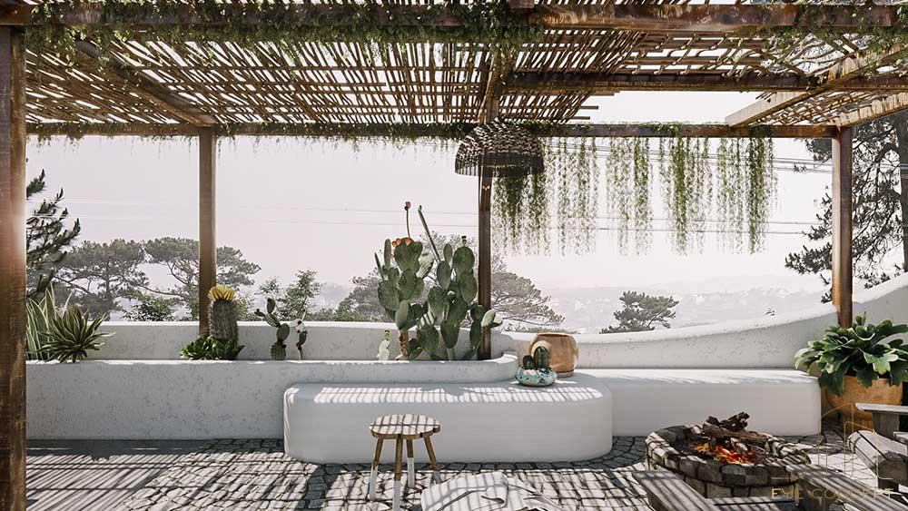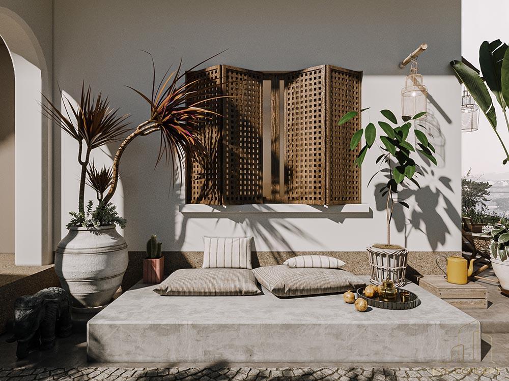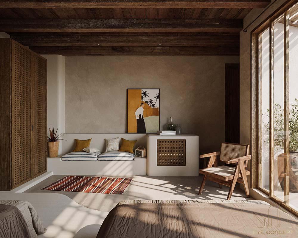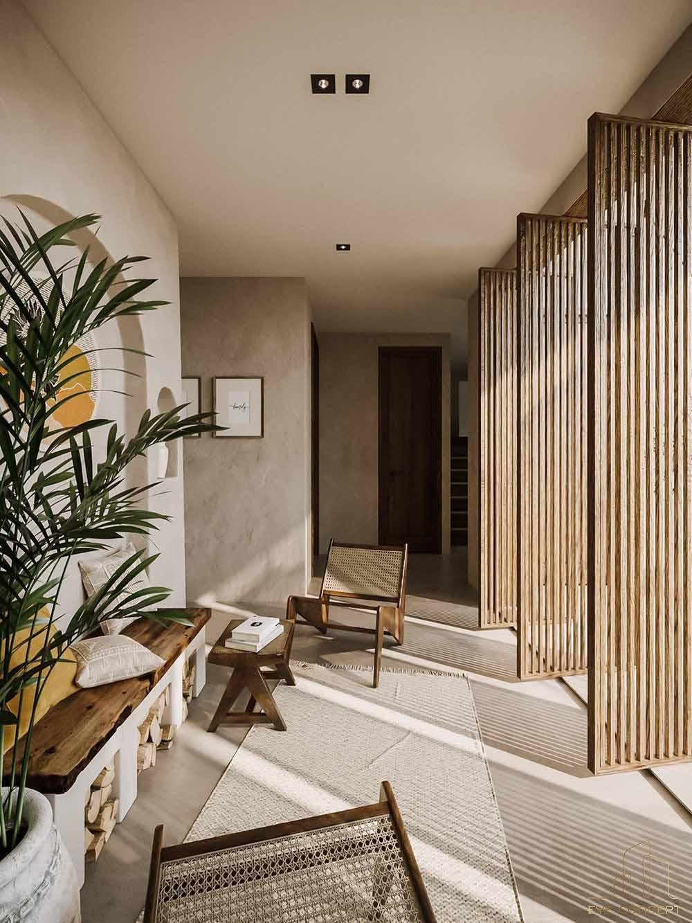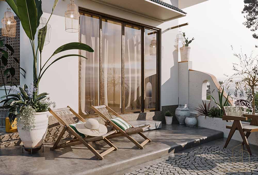 Dự án là bản vẽ được chắp nối từ ý tưởng của Chủ đầu tư, mong muốn tạo ra một không gian nghỉ dưỡng mộc mạc, tinh tế, và đề cao tính thẩm mỹ . Thấu hiểu ý tưởng của Khách hàng, đội ngũ thiết kế của EYE CONCEPT đã dựng nên bản thiết kế mà ở đó những sắc màu nổi bật không được dùng làm tâm điểm. Chúng tôi tôn trọng hoàn toàn màu nguyên bản của các chất liệu tự nhiên như gỗ, rèm cửa linen, beton mài, hay cả bờ tường cũng được tính toán xử lý sao cho tự nhiên nhất.